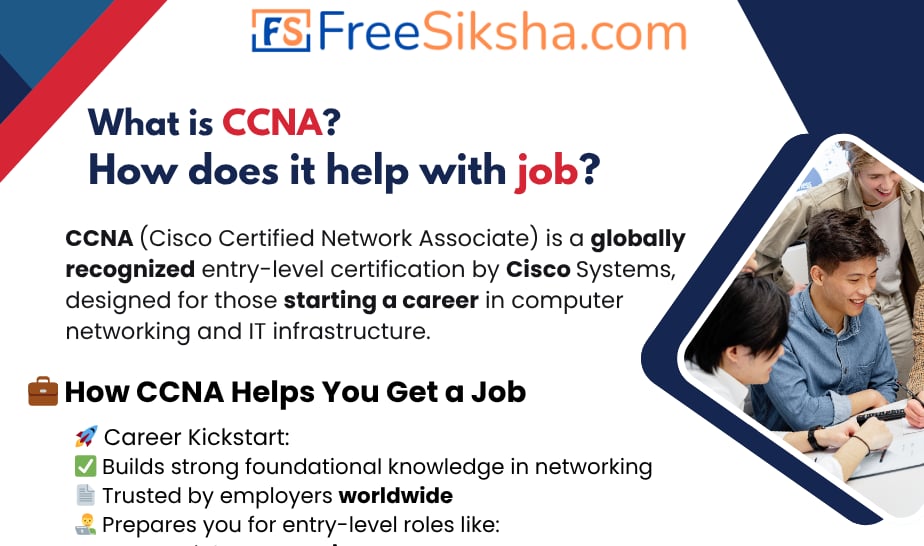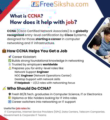 In today’s digital world, networking forms the backbone of every organization. This is where CCNA (Cisco Certified Network Associate) plays a vital role. CCNA helps beginners understand: How networks work, How devices communicate, How data flows securely. In 2025, organizations continue to rely heavily on skilled networking professionals, making CCNA a strong foundation for IT careers. At FreeSiksha.com, we offer free CCNA training so learners can gain these essential skills without worrying about cost. Education should open doors — not close them.